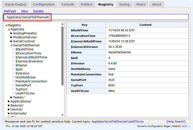 Once it’s running, the registry keys for it should be created in the Registry tab. Go to the Registry tab, and under AppData/SerialToEthernet should be keys to set up Serial-to-Ethernet.
