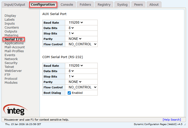 Lastly, you’ll need to define the settings of your serial connection. This is done under the Configuration tab, in the Serial I/O section. Here you can change the settings for either the AUX or COM (RS-232) ports. These settings should be configured to match the settings of your serial device’s connection. (If you are using the COM/RS-232 port, make sure to disable the Boot Dialog for it.) Once set, give the JNIOR another reboot, and it should be ready to help your device communicate!