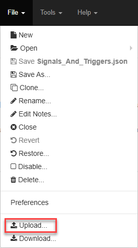 To upload a workspace from Tasker, you’ll want to click on the file tab and in the drop-down select the upload option.